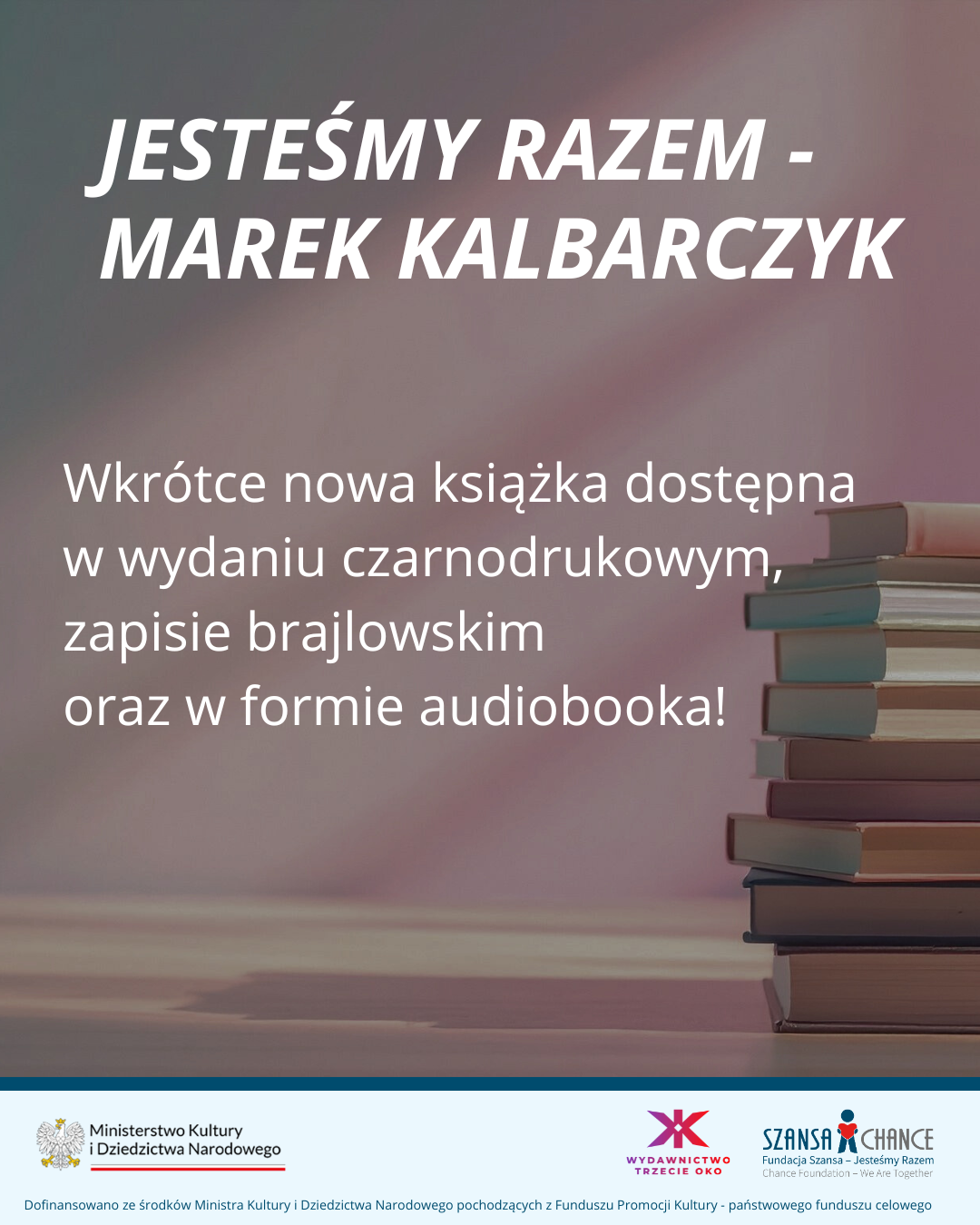 Fundacja z dumą prezentuje najnowszy projekt, którego celem jest zwiększenie dostępu do literatury dla osób z niepełnosprawnością wzroku oraz ich otoczenia. Do czytelników trafi nowa książka Marka Kalbarczyka pt. „Jesteśmy razem” – niezwykła publikacja ukazująca rzeczywistość z perspektywy autora niewidomego. Będzie to inspirująca opowieść, stanowiąca podsumowanie 33 lat działalności Fundacji Szansa – Jesteśmy razem.