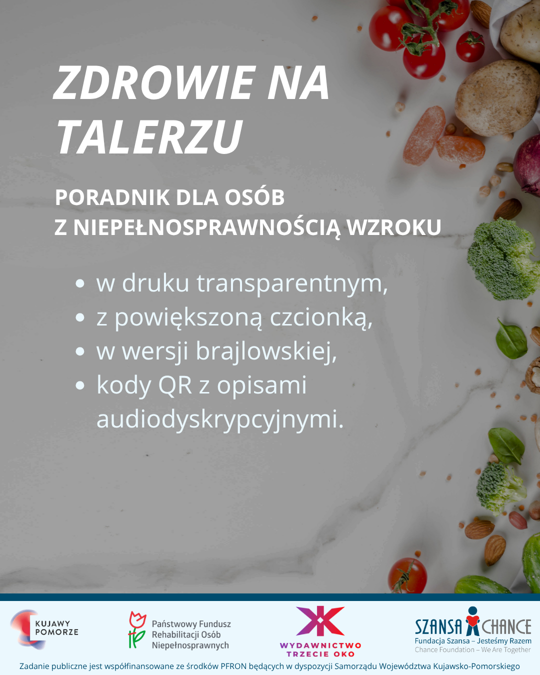 Z dumą przedstawiamy książkę „Zdrowie na talerzu – poradnik dla osób z niepełnosprawnością wzroku”, którą przekazujemy w ręce czytelników oraz instytucji i organizacji z całego województwa kujawsko-pomorskiego.